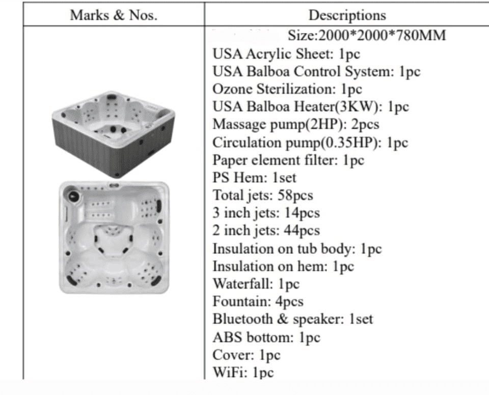Енергийна Ефективност (Изолация): Джакузи 200×200 е оборудвано с висококачествена многослойна изолация на корпуса и облицовката, което е жизненоважно за поддържане на постоянна температура. Тази изолация гарантира минимални експлоатационни разходи – важен фактор, когато се използва като външно джакузи през зимата.